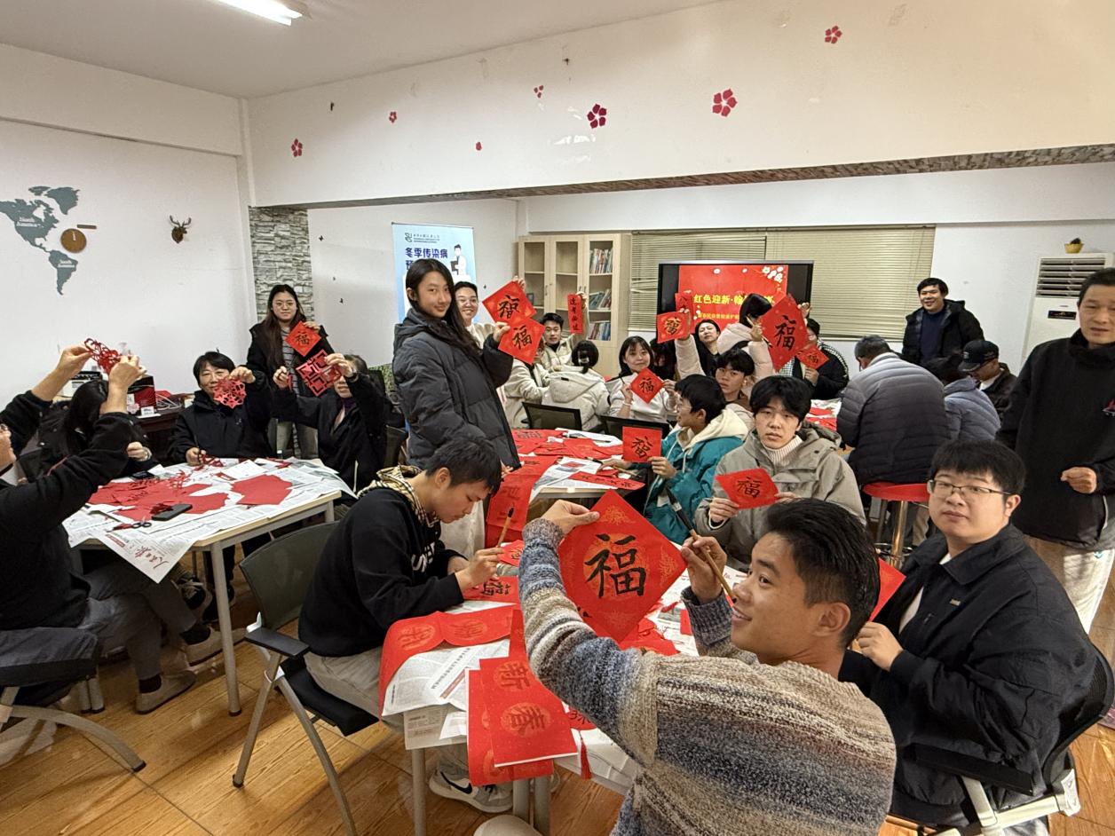 “活动内容特别丰富,既能写福字、剪窗花,感受满满年味,又能学到健康和食品安全知识,感觉很暖心。”同学们在参与了各个区域的活动后兴奋地说。活动现场温馨热烈,同学们创作的书画窗花作品将被精心张贴在公寓公共区域,与健康宣传栏共同构成一道喜庆祥和、关怀备至的“红色文化生活长廊”,以红色文化滋养精神家园。